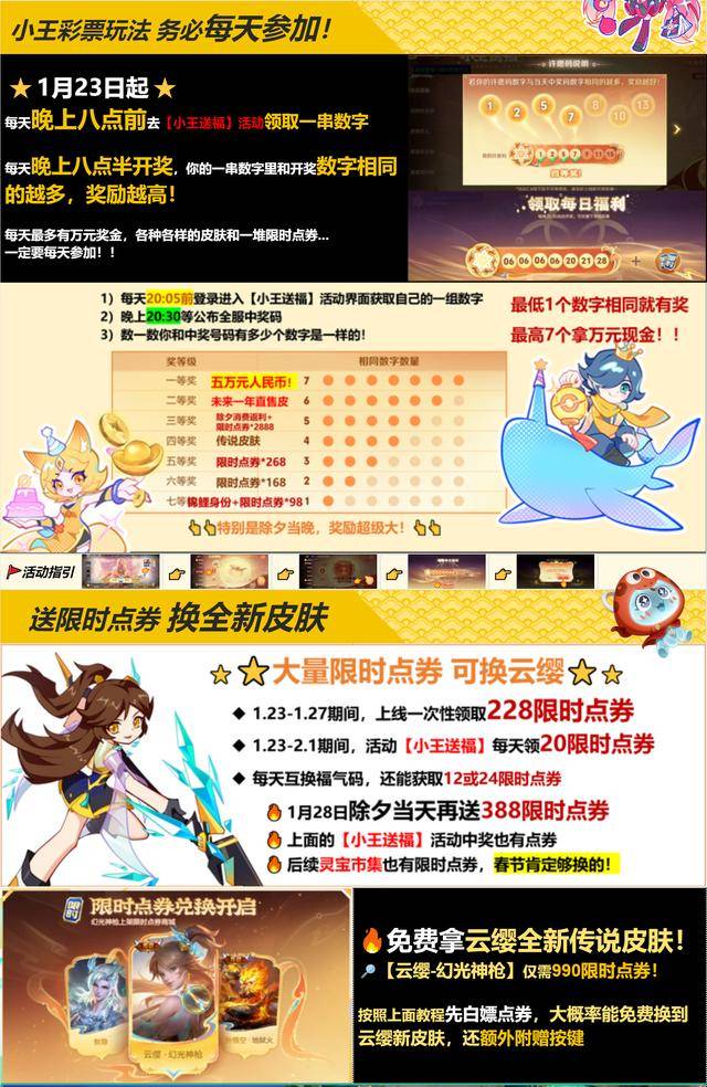 攻略中还介绍了王者荣耀的“彩票”玩法,从1月23日起,每晚8点前,玩家们可以领取一串数字参与抽奖,晚上8点半开奖,奖品最高可达万元现金,除夕当天更是直接送出5万元大奖。同时,还有大量限时点券等你来拿。从1月23日至27日,玩家们可以一次性领取228限时点券,除夕当天则可领取388限时点券。参与送福活动每天还能领取20点券,灵宝市集也将有限时点券发放,攒够990限时点券兑换云缨全新传说皮肤及其按键,并非难事。