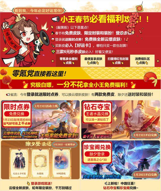 随着春节的临近,王者荣耀玩家们迎来了期盼已久的蛇年春节版本,版本中不仅包含了丰富多彩的新皮肤,还有一系列诱人的福利活动。为了帮助玩家更好地享受这些福利,王者荣耀官方精心准备了一份详尽的在线攻略文档,让玩家们可以轻松“照搬”,省去了不少研究时间。