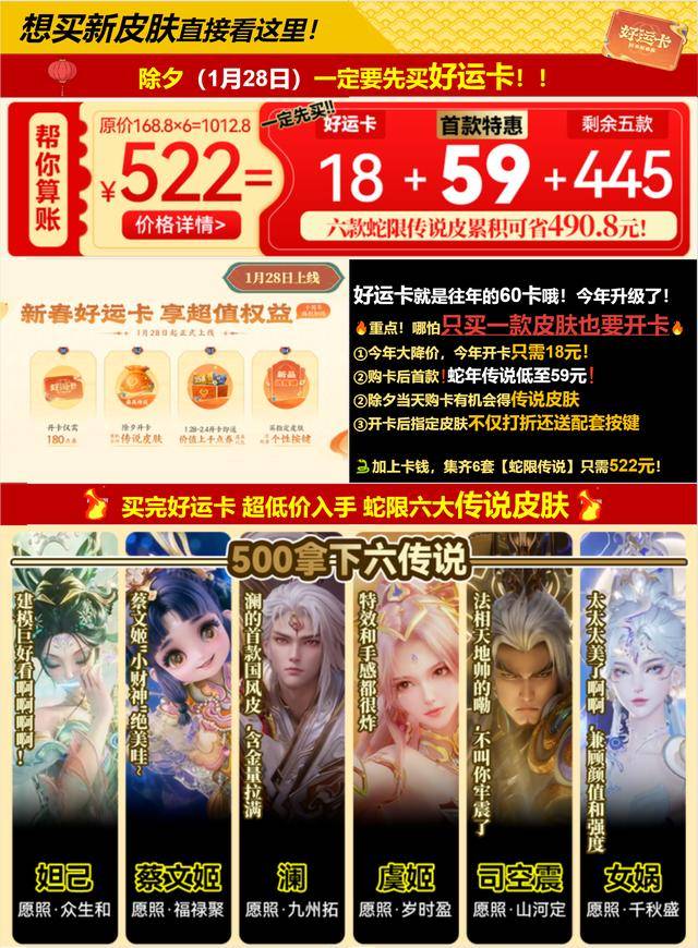 这份攻略首先强调了除夕(1月28日)购买好运卡的重要性。购买好运卡后,六套年限皮肤的到手价仅为522元,即便是只打算购买一款皮肤的玩家,开卡也极为划算,因为开卡不仅能让年限皮肤享受折扣,购买指定皮肤还会赠送配套按键。除夕当天开卡还有机会获得传说皮肤,这无疑为玩家们增添了一份惊喜。